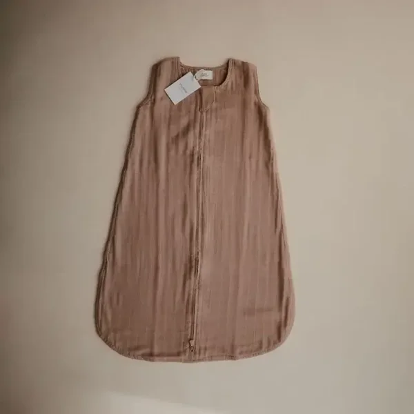 De sleeping bag is mouwloos, heeft een mooie zachte caramel / bruine kleur en bestaat uit 100% mousseline katoen. Ideaal voor cozy dutjes of heerlijk knuffelen met mama of papa. Dit slaapzakje is gemaakt voor kindjes van 0 tot 6 maanden.