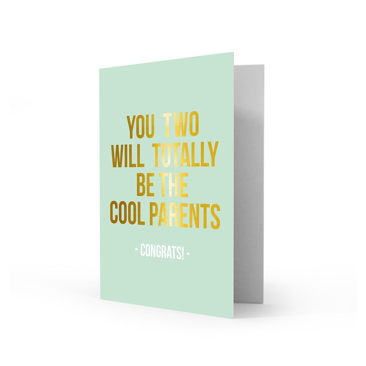 Feliciteer met een leuke wenskaart. Dit grappige muntgroene ontwerp met 'You two will totally be the cool parents' opschrift is van Studio Stationery.